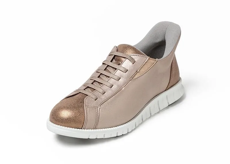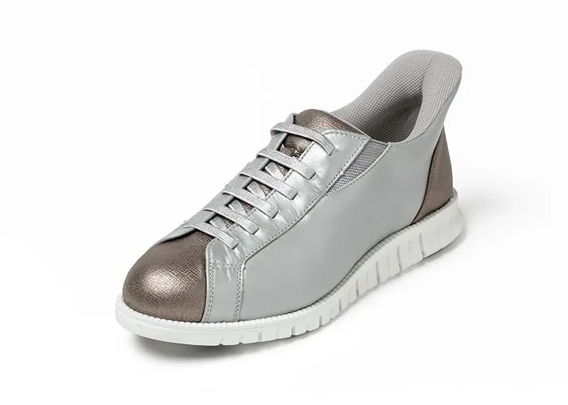 伸縮性のある紐使いや足入れしやすい機能付きのレザースニーカー。